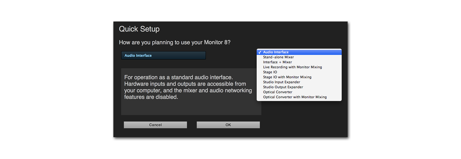 Monitor 8は非常に柔軟な設定が可能で、ステージやスタジオなど、多くの場面で活躍することでしょう。 クイックセットアップメニューは様々な状況を想定したプリセットを搭載し、標準的なオーディオインターフェイスとしての設定から、ネットワーク上のデバイスとしての設定まで、瞬時にMonitor 8を再構成します。 もちろんルーティングやミキサーの設定など、ご自身のニーズに合わせてカスタマイズし、プリセットとして保存することも可能です。