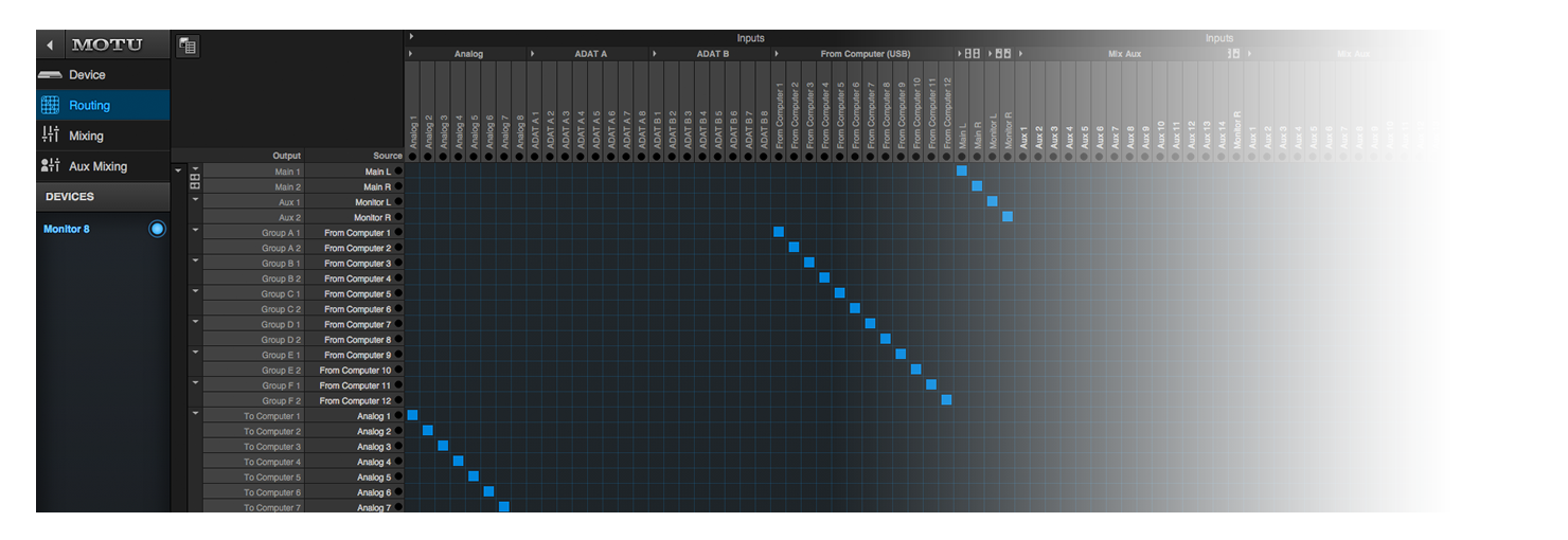 ワンクリックでお好きなようにルーティングが可能です。 ソースはMonitor 8のアナログまたはデジタル入力、ホストアプリケーション、ミキサーのバス出力、あるいはAVBネットワーク上の他の機器のチャンネルを割り当てることが出来ます。 出力先は、AVBネットワーク上の他のインターフェイスの出力、ホストアプリケーションの入力、ミキサーの入力などを選択することが可能です。 さら1つのソースを複数の出力に割り当て、同時に出力することもできます。