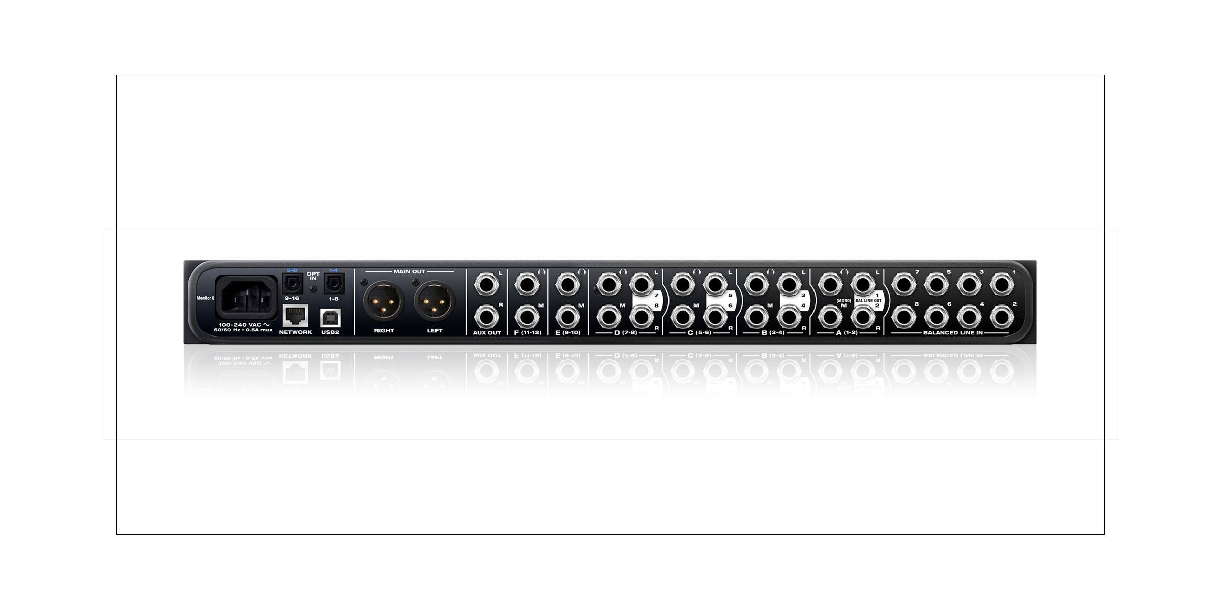 Monitor 8は最大24インプットと8つのステレオグループアウト(Main / AUX / A – Fのグループ) を搭載しています。 入力は8chの高品質アナログインプットと16ch(2バンク)のADATを装備し、最大64chのAVBストリーム内の信号を8つのステレオグループアウトに振り分けることができます。