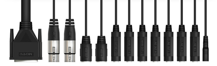 この設計は、接続端子の耐久性や外部ノイズの干渉を最大限に押えたMOTUのこだわりと配慮です。 ブレークアウトケーブルや別売のブレークアウトボックスは、音質を最優先にしたカスタム設計で、耐久性のみならず音質面でもこれまでのデスクトップインターフェイスとは一線を画します。