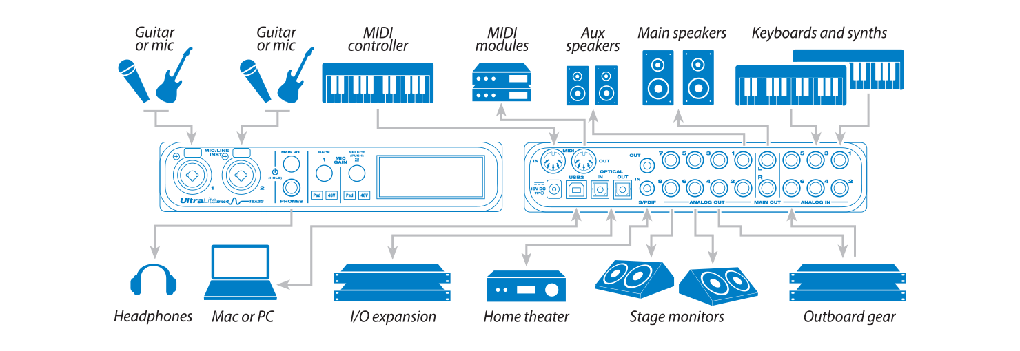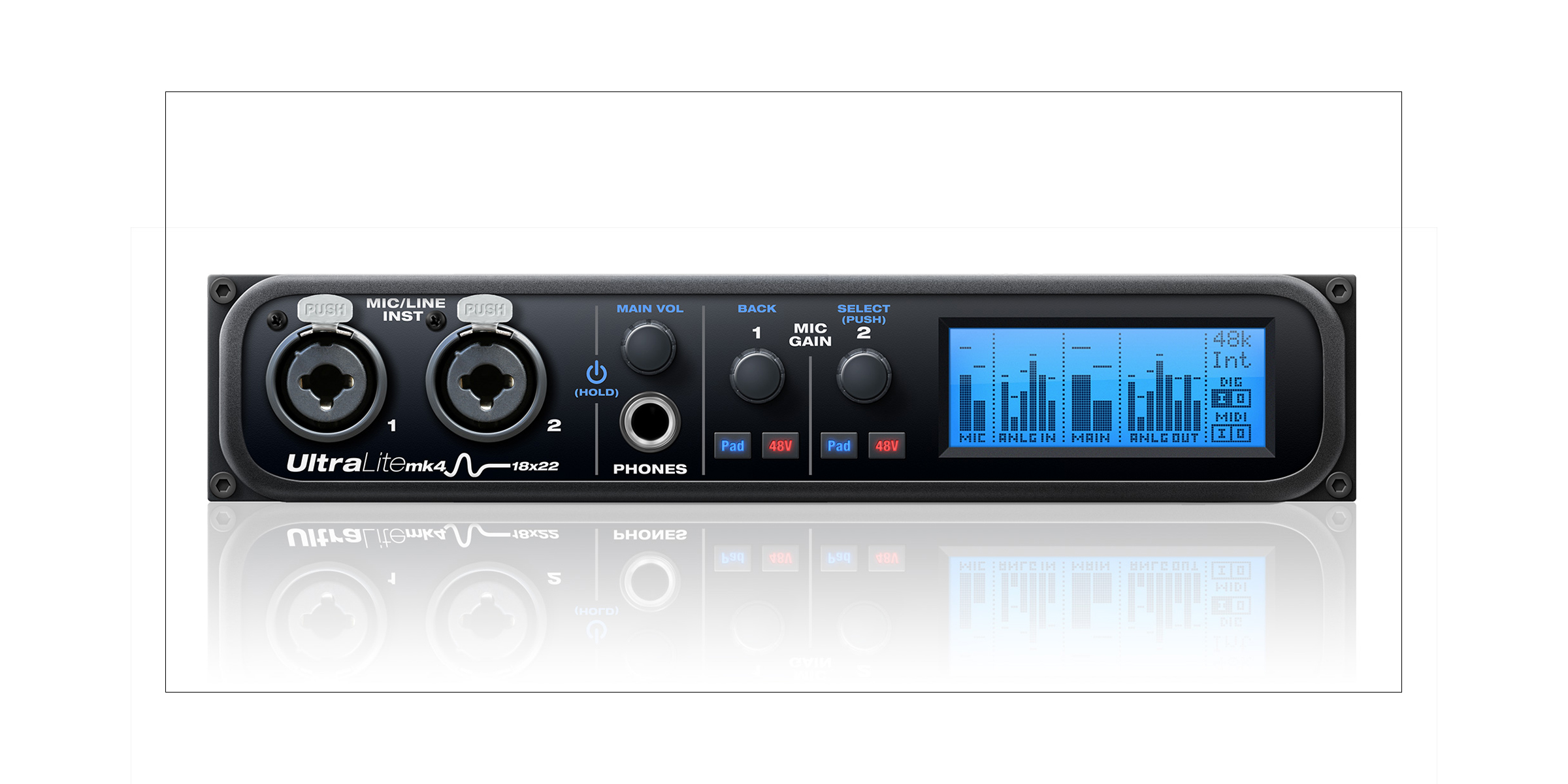 UltraLite-mk4はフレキシブルなモバイル型USB2オーディオ接続でローレーテンシを実現し、素晴らしいアナログ・サウンド・クオリティでサンプルレートは192kHzまで対応しています。