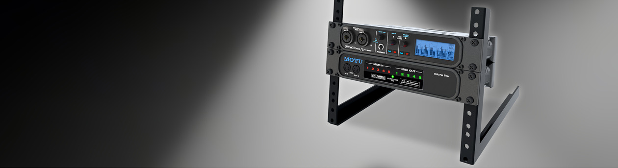 同梱されているブラケットと六角ボルトを使えばUltraLite-mk4をラックマウン トすることが出来ます。写真はMOTU のmicro lite MIDIインターフェイスと並ん でいる状態です。