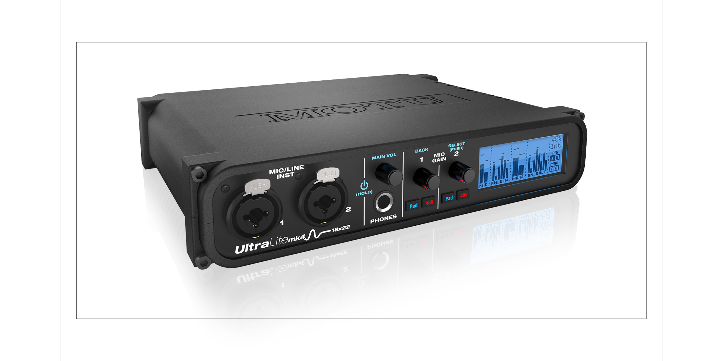 MOTUの非常にポピュラーな、数々の賞を受賞したUltraLiteインターフェイス・シリーズの最新版、UltraLite-mk4は18イン, 22アウトのオーディオインターフェイスで DSPミキシング、エフェクト・プロセッシングを備え、このクラスでは最高のアナログ・オーディオ・クオリティで外部でのモバイル・レコーディングにも最適です。ハイスピードの USB 2.0でコンピューターに接続し、 新たにローレーテンシに最適化されたドライバ(クラス・コンプライアント、USB 3.0とiOSに対応)サンプリング・レートは192 kHzまで、2つのXLR/TRS マイク/ギター・インプット、6個のラインレベル・アナログインプット、10個のアナログアウト、8チャンネルのオプティカル-I/O(2チャンネルのTOSLinkとしても使用可能)、 RCA S/PDIFデジタルI/O、MIDI I/O、そしてヘッドフォン・アウトを装備しています。搭載されているパワフルなDSPはラージ・コンソールのミキシングスタイルを実現し、48チャンネル、12 ステレオバス、そして32-bit浮動小数点ポイントのエフェクト・プロセッシングにはモデリングされたアナログEQやビンテージタイプのコンプレッション、クラシック・リバーブを含みます。マトリックス・ルーティングでは入出力のパッチングが素早く可能で、また入力をスプリットして複数の出力にアサインすることができます。またUltraLite-mk4はスタンドアローン・ミキサーとして使用することが可能で、あなたのiPad™、iPhone™、タブレット、スマートフォーン、ラップトップから革新的なWeb appでワイヤレスでコントロールすることができます。スタジオからステージまでUltraLite-mk4はずば抜けたサウンド・クオリティ、素晴らしい操作性、安定したパフォーマンスを約束します。
