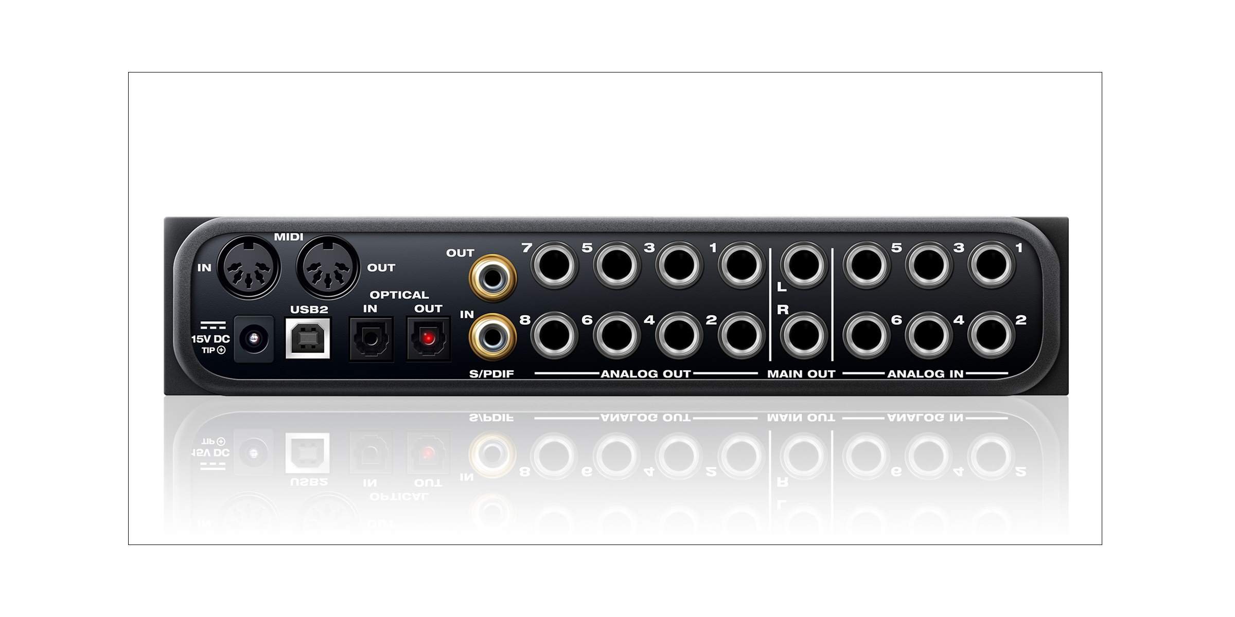 2 マイク/ギターインプット、6ラインイン、10ラインアウト、ヘッドフォン・アウト、S/PDIFデジタルI/Oと8-チャンネルのオプティカルI/Oの合計で18 イン&22アウト