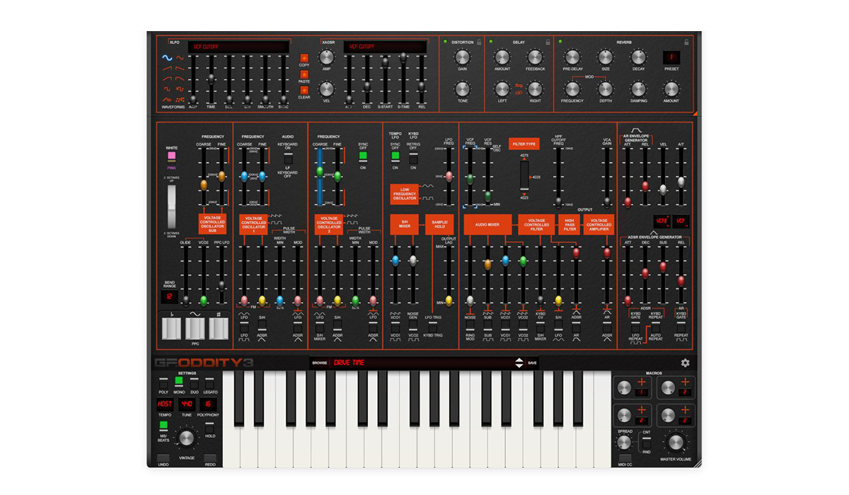 モノフォニックおよびポリフォニックの演奏性、調整可能なサブ・オシレーター、独自の X-Modifier テクノロジー、オンボード・エフェクト、ボイス・パンニングを追加し、名機ののオリジナル機能を大幅にアップデートし、Oddity3 には多数の新機能と実機には存在しない改善が加えられています。新たに収録されたパワフルなプリセット ブラウザー、プログラム可能なマクロ、ベロシティとポリフォニック・アフタータッチによるパフォーマンス性能の向上のほか、アナログ機器の持つ不完全さを伴う挙動をも再現するビンテージのノブ・ダイアル、新しいディストーションとリバーブ・エフェクトなどのアップデートが図られています。