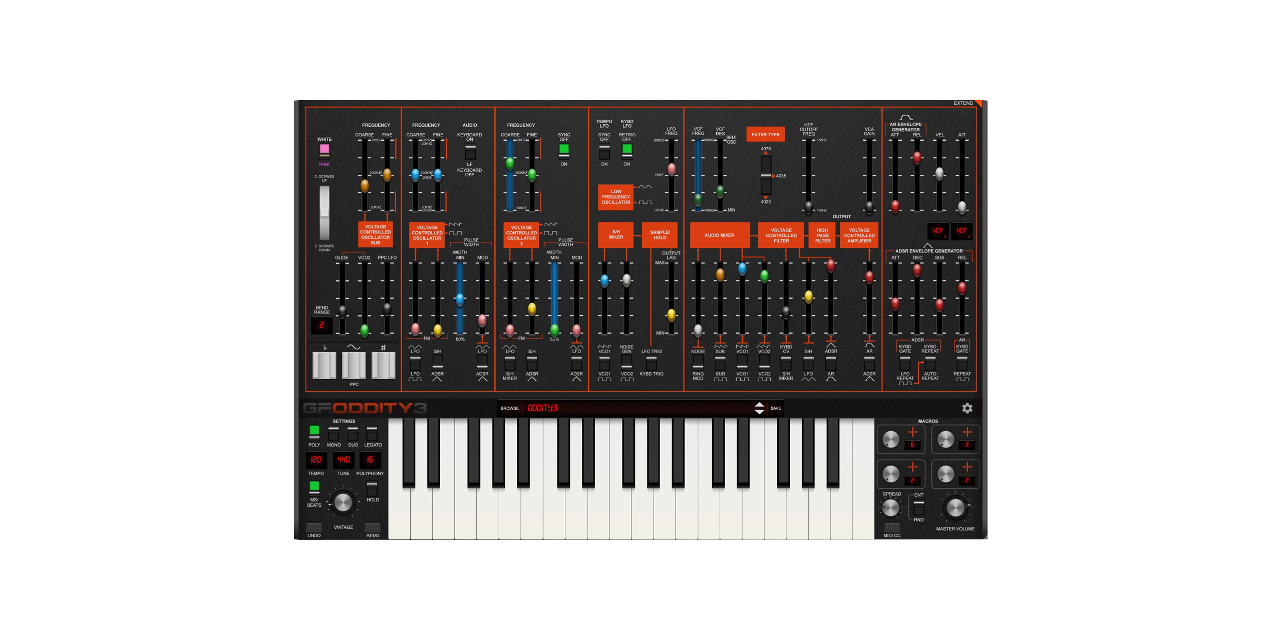 音楽史を象徴するオリジナルのハードウェアのサウンドとキャラクターをコアに持つ Oddity3 は、名機の復刻だけに留まらず、伝説のシンセに新たな命を吹き込みます。 3 つのフィルターすべては実機同様の挙動を実現し、さらに同期可能な 2 つのオシレーター、伝説とされるオリジナルのリング・モジュレーターの正確な再現、AR および ADSR エンベロープなど、大規模な開発期間を経て、Oddity3 が誕生しました。