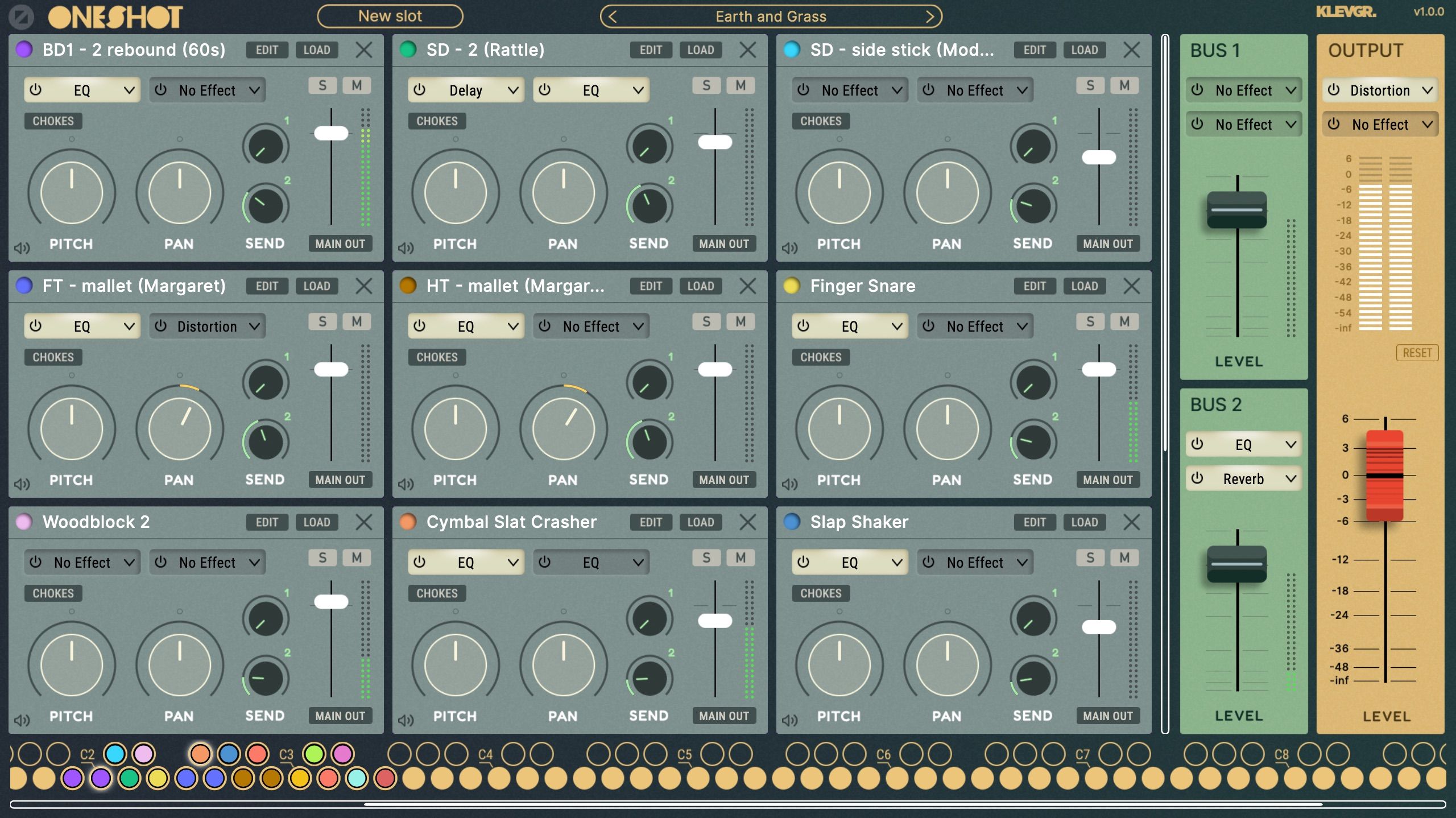 OneShotのスロットは内部ミキサー内の独自のチャンネルに紐づき、エフェクトを追加したり、ピッチ、パン、ボリュームを変更したり、2つのバスにパラレル信号を送信することもできます。 2つのバスとメイン出力にもそれぞれ2つのエフェクトスロットが設けられています。OneShotには、EQ、コンプレッサー、ディレイ、リバーブ、ディストーション、ステレオ幅など、任意のチャンネル、バス、または出力に挿入できる大規模なエフェクトのセットが付属しています。OneShotはマルチ出力もサポートしており、DAW でさらに処理するために各チャンネルを個別のホスト出力チャンネルにルーティングできます。