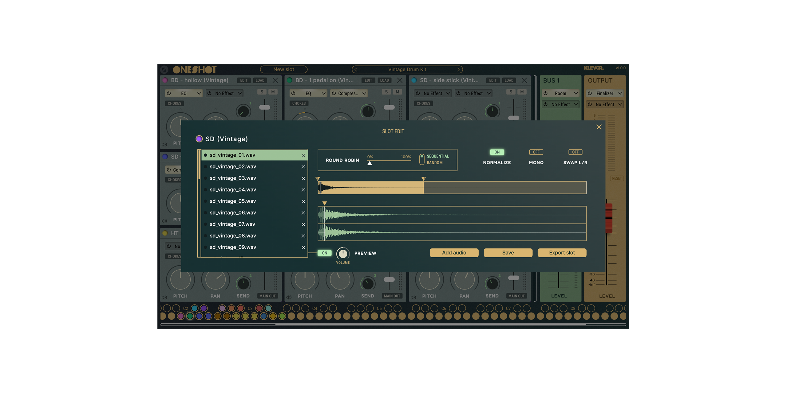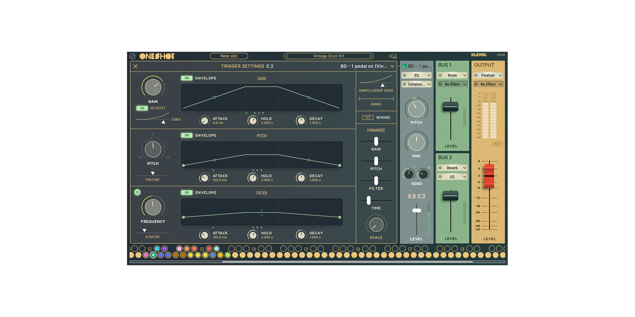 OneShotの核となるのは、トリガーによってアクティブにされるスロットです。スロットは1つまたは複数のオーディオファイルで構成され、例えばベロシティの異なる複数のサンプルで構成されるスネアなどがあります。トリガーはMIDIノートにマッピングされ、個々のエンベロープやヒューマナイズ設定などが含まれます。1つのスロットは複数のトリガーでアクティブにすることができ、各トリガーはそれぞれ独自の設定を持っているため、同じスロットを複数のトリガーで使用することで便利なバリエーションを追加することができます。