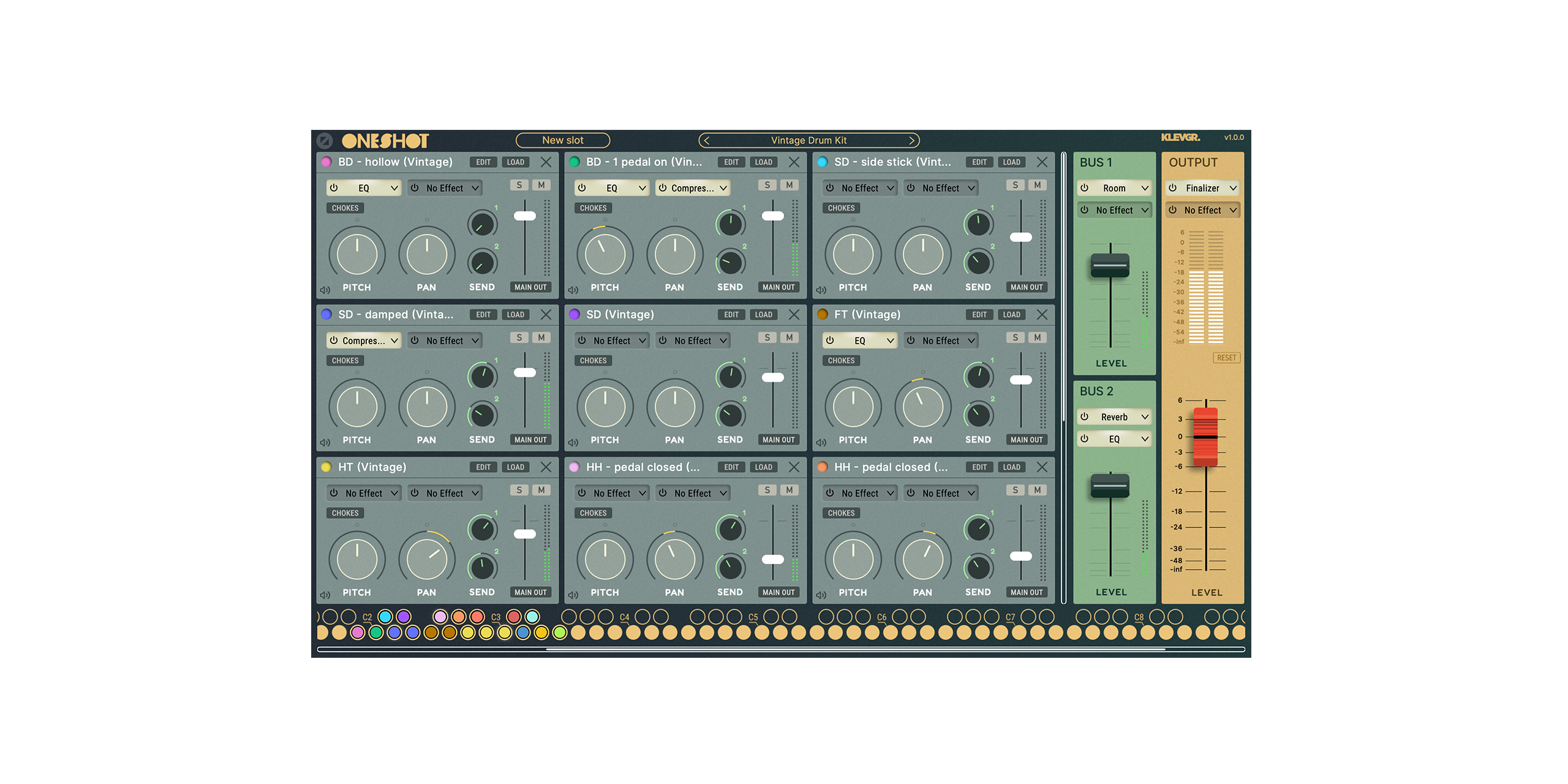 スウェーデンのプラグイン・デベロッパーKlevgrand は、Slammer、Borsta、Ting、Skakaなど、従来のリズムパフォーマンスの常識を覆すドラムパーカッション・インストゥルメントの開発によって、その卓越した技術で多くのユーザーから支持を獲得し続けています。Klevgrandがこれまでで最大かつ最も機能的なドラム・インストゥルメント、OneShot をリリースしました。OneShotは、ドラムサンプル用のスムーズで完全なワークステーションとして仕上がっています。OneShot には、ヒューマナイズ設定、ベロシティ・レイヤリング、ラウンド・ロビンなど、ドラムにオーガニックな風合いを与える豊富な機能が詰まっています。さらに、チョーキング、フィルター、エンベロープ、広範なエフェクトシステム、マルチアウト・ルーティングなど最新DAW環境との高い親和性を保持しています。多機能ドラムサンプラーとしての操作性に躊躇は必要ありません。これらすべての機能を備えていても、OneShotは非常に使いやすく、柔軟かつ直感的なKlevgrandならではの扱いやすく素早いワークフローを保ちながら、ドラム演奏のあらゆるニーズに対応する広範なハブを提供します。