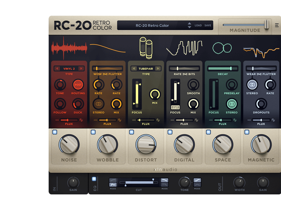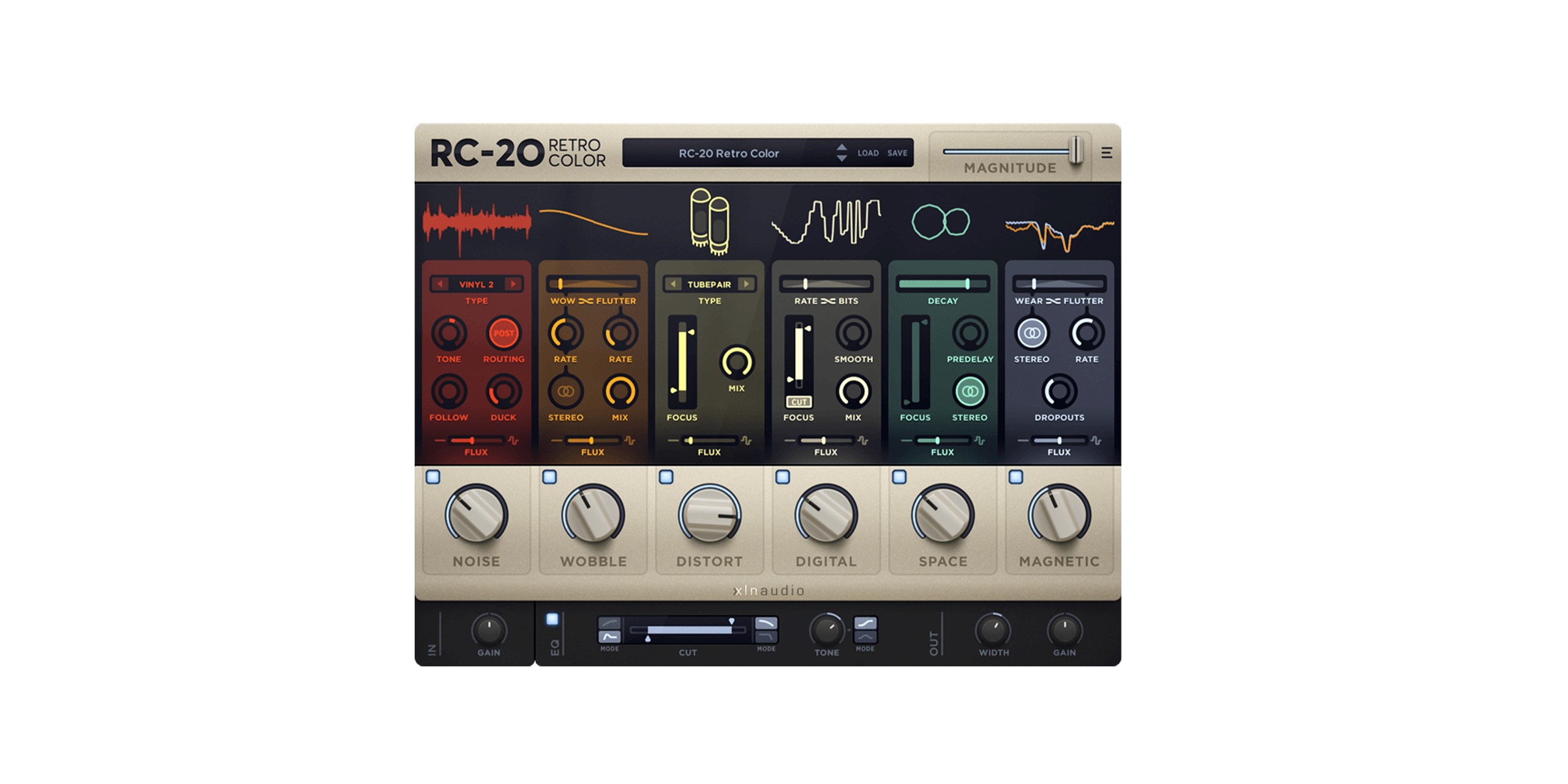 伝統的なヴィンテージ機材にインスパイアされた質感、そのきめ細やかさと活力をDAWにもたらします。ドラム、ギター、キーボード、ベースなどの各トラックに対して有効なのはもちろん、フルミックスにも抜群もフィールを与え、ポストプロダクションでも活躍します。RC-20用に開発された”Flux”エンジンによりサウンドに対して、往年の名機が持つ温かみや、アナログ機器独自の“ゆらぎ”や周期的変動を追加することも可能としています。