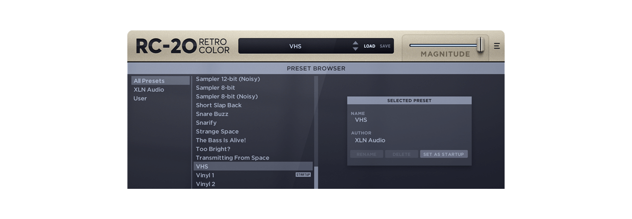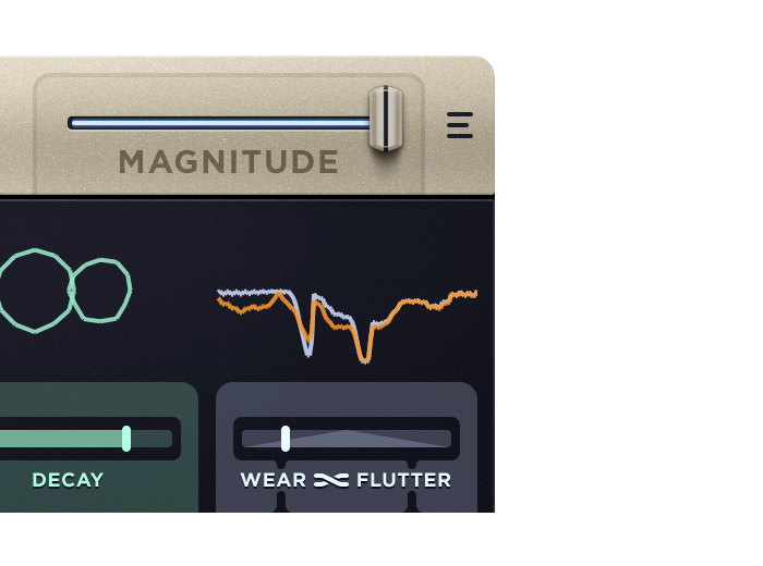 Magnitude sliderはプロセスの強さをコントロールします。 いつでも簡単に使えます。 ― プリセットをブラウジング中でも ― これでパーフェクトなサウンドとそのプロセス量を簡単に決めることが出来ます。是非このコントロールを使って素晴らしいイントロやブレークダウン、曲の転換などに生かしてみてください。
