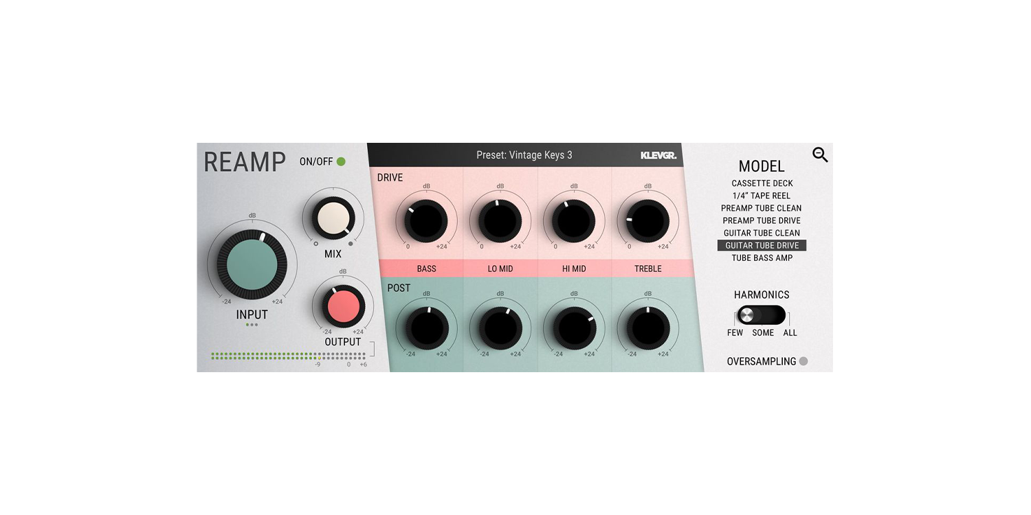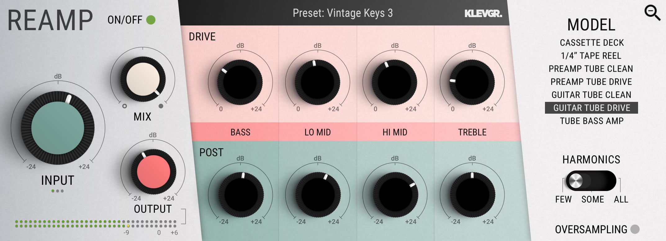 REAMPは複雑なスペクトル・サチュレーション・プロセッサであり、Krevgrand 独自のアプローチに基づき、さまざまなアナログギアのセットをシミュレートします。REAMP アルゴリズムの主な利点は、CPU効率が高く、低レイテンシー化を両立していることです。 REAMPに搭載された7つの”MODEL”は、実在するアナログギアの特性に基づいており、2次元で個別に測定されています。 20Hz〜20kHzの周波数スペクトルでのゲインレスポンス(-inf dB〜 + 6 dB)。 これは、入力信号をオーディオ出力に変換するために使用されます。 4バンドのスペクトルドライブを使用すると、ユニットをさらに機能させることができます。