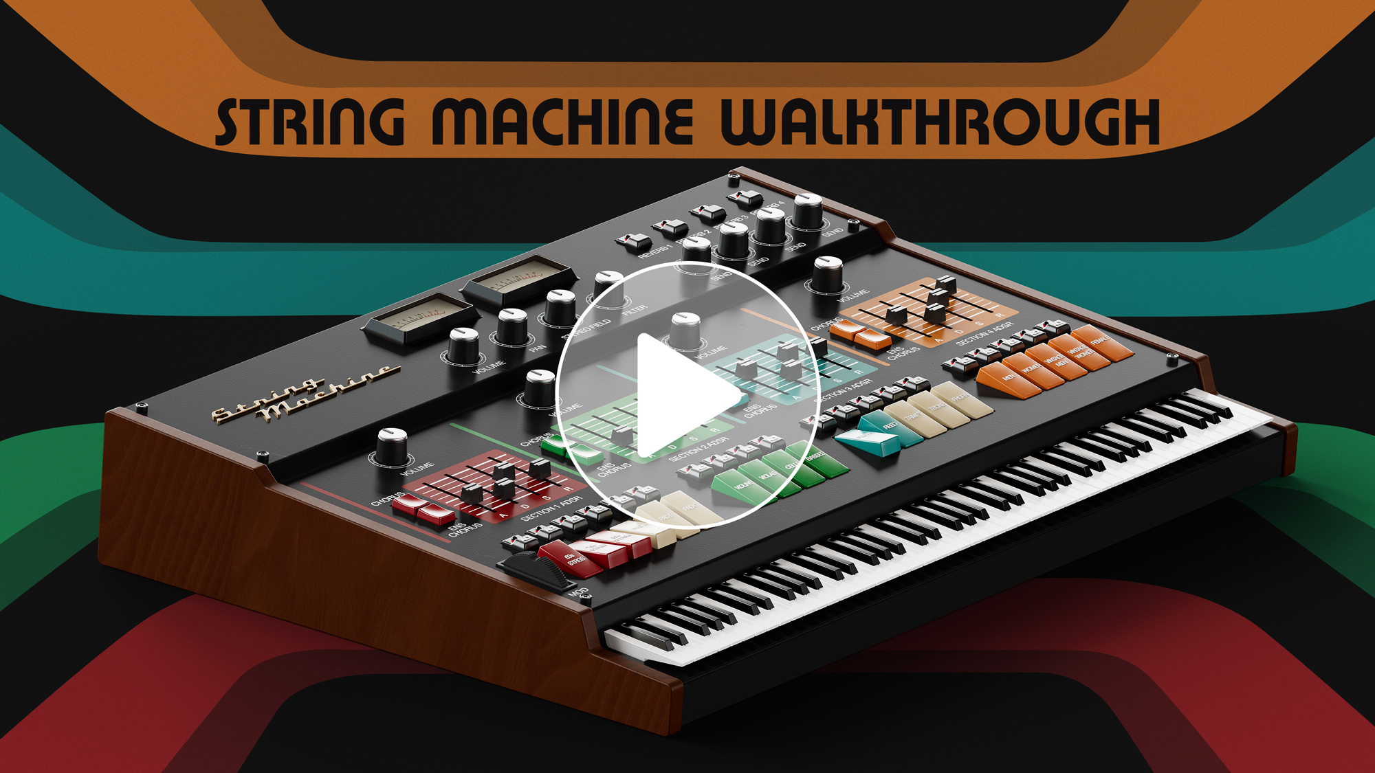 String Machine のユーザーインターフェイスは、ヴィンテージのストリングマシン・シンセサイザーのデザインからインスピレーションを得ています。