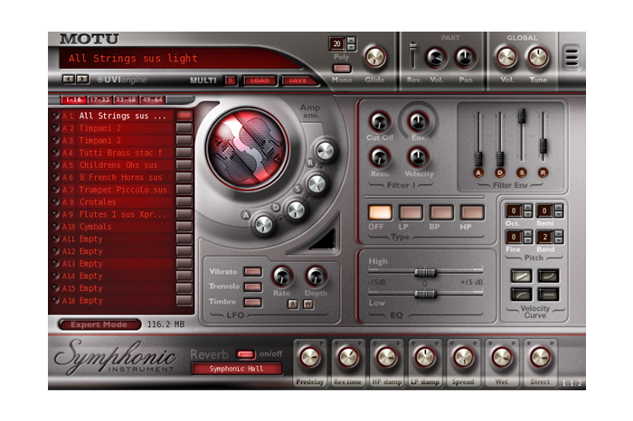 MOTU Symphonic Instrument(=MSI/ モツシンフォニックインストゥルメント)は、必要な楽器をすべて備えながらもシンプルに使用できるオーケストラに特化したソフトウェア音源です。ソロや小編成の楽器からフルオーケストラまで、MSIに収録されています。8GB容量はワールドクラスのオーケストラとプレーヤーを招いて高いオーディオ特性と詳細さを兼ね備えながら、適度な容量消費におさえたバランスの良いハイクォリティ音源です。