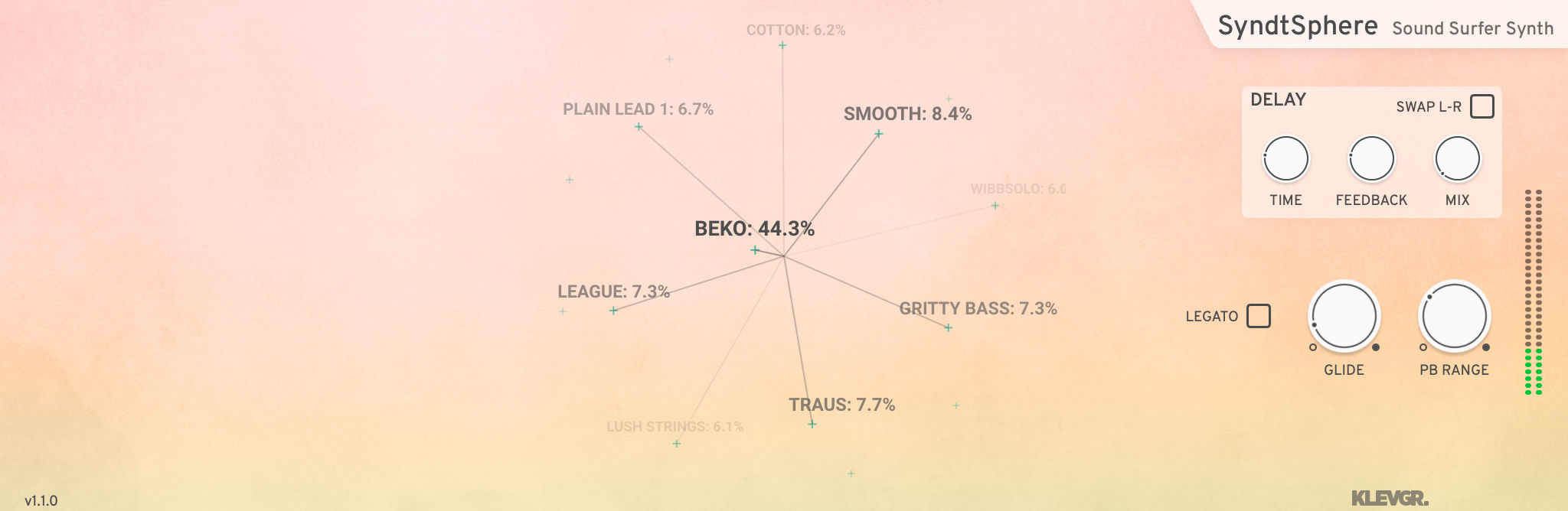 SyndtSphereは基本的に、ポリフォニック・シンセサイザーSyndtの球体バージョンです。ミニマルなアプローチで、プリセット間の「サーフィン」のようなユニークな体験を特徴としています。すべてのパラメーターは、さまざまなプリセットの近さに応じてモーフィングされます。70種を超えるプロフェッショナルが作成した状態で構成される球体を回転させることにより、特定のパラメーターを処理しなくても、誰でも完璧なサウンドをダイヤルできます。球体に加えて、ピンポンディレイとグローバル設定の変更も利用可能です。