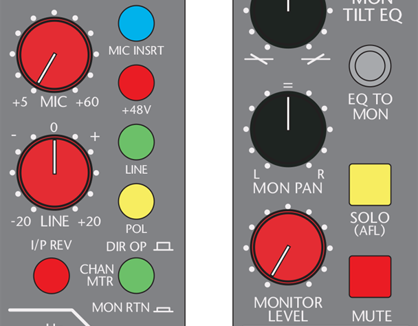 4バンドの帯域可変可能なTrident EQがこのコンソールの中核となっています。すべてのチャンネルに搭載されたフル機能のEQだけではなく、モニターセクションにはTilt EQも設けられています。更にフルEQをインプットパスからモニターパスへの切り替えも可能で、EQには独自のインサートも設けられています。プリアンプと同様に、EQパスにも他のアウトボードのEQインサートも行え、バイパスもしくは併用した使用も可能です。