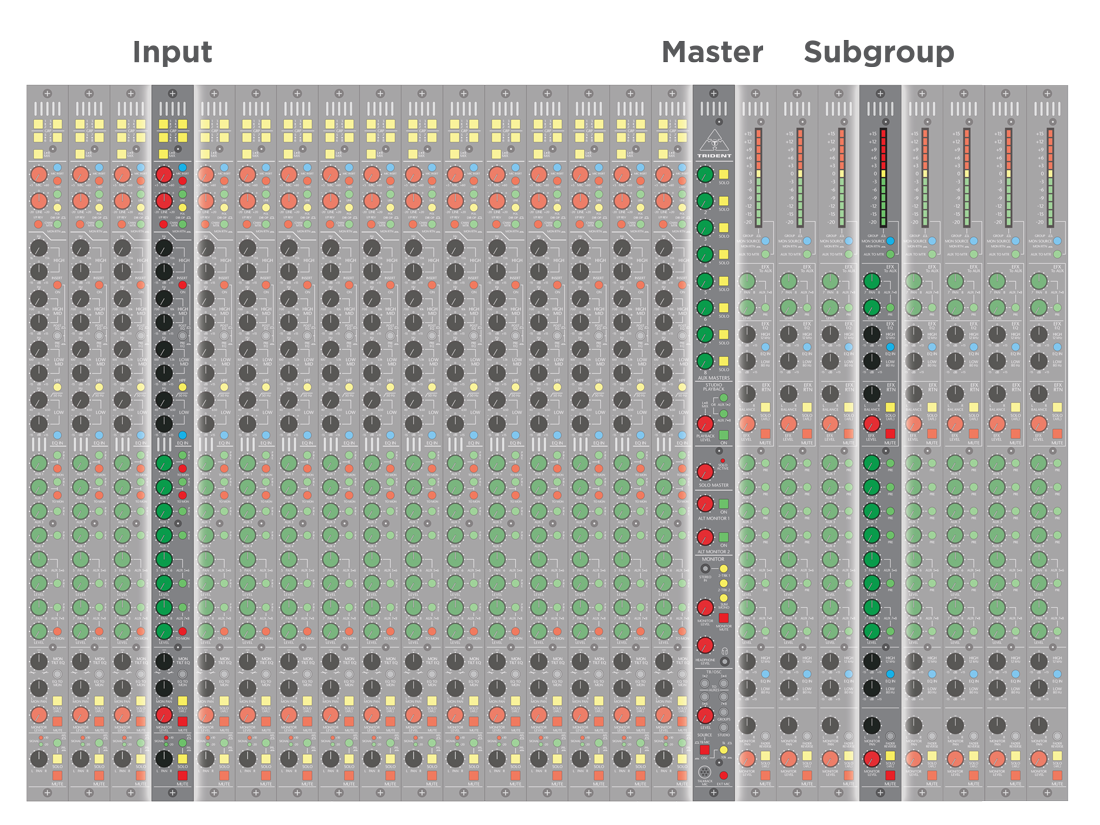 Split / Inlineコンソールを効果的に使用すると、ステレオバスへの入力が倍になります。これは今日現存するレコーディングコンソールの一般的な構成を踏襲しています。Tridentはそれを更に進化させ、同じくメインチャンネルEQと交換することができるモニターパスにEQを使いました。