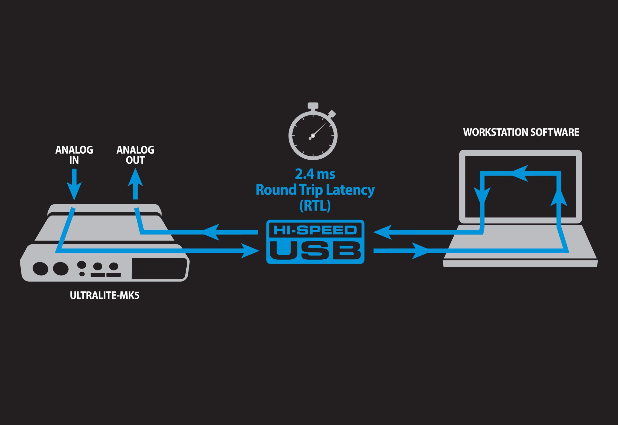 UltraLite-mk5は、Digital Performerなどの高性能DAWで、USB(96 kHz、32サンプルホストバッファー)で2.4ミリ秒(ミリ秒)の驚異的なラウンド・トリップ・レイテンシー(RTL)を実現します。