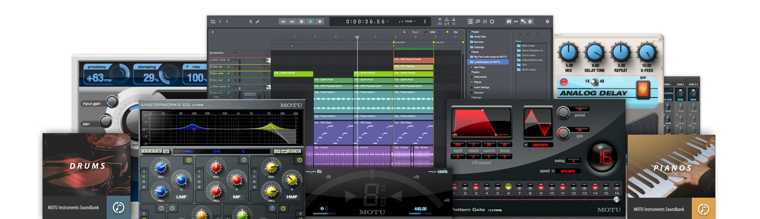 制作用ソフトウェアのほか、業界のリーダーであるBig Fish Audio、Lucidsamples、Loopmastersから提供された何百ものループ、ワンショット、サウンドも収録しています。(登録後ダウンロードにて提供)